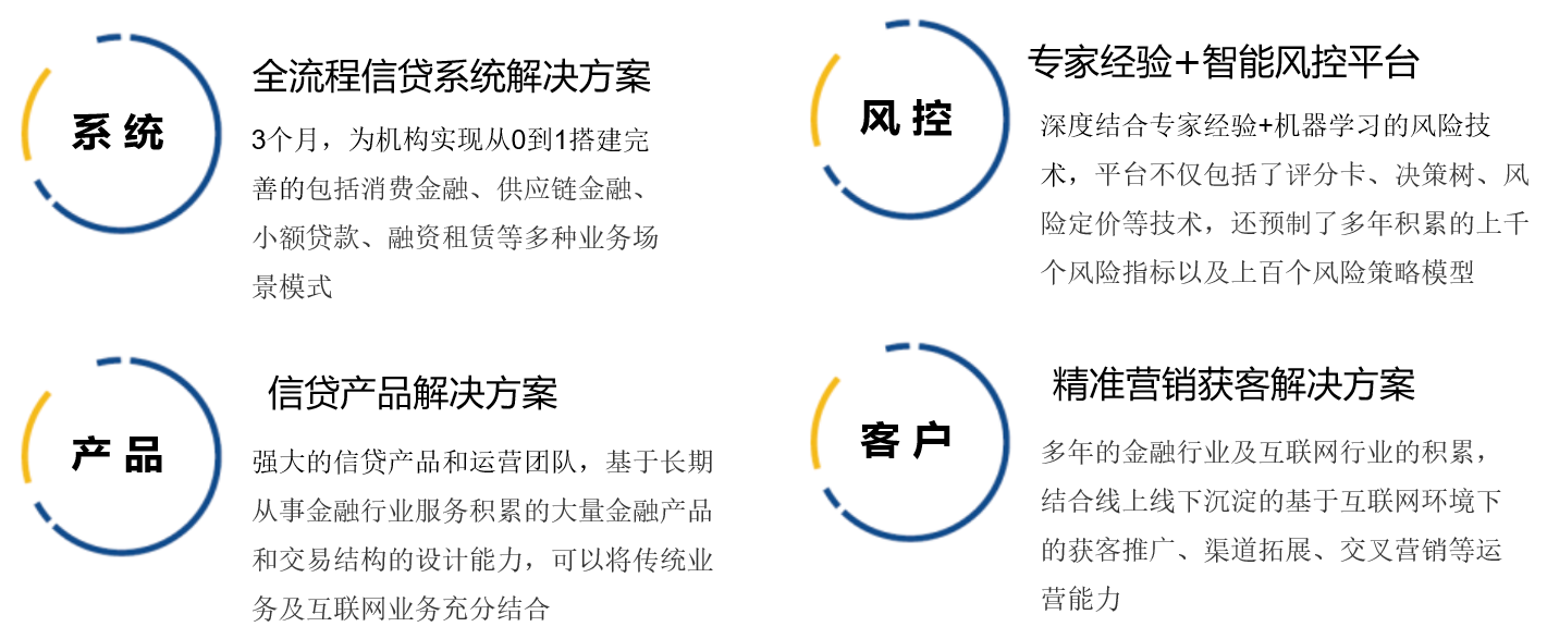 为合作机构在个人消费信贷、小微企业贷款等业务场景提供一站式智能信贷解决方案,包括智能科技产品组合、智能获客解决方案和全流程风控技术辅助服务,助力合作机构在系统研发建设、获客、风控等核心环节降本增效,迅速开展业务。